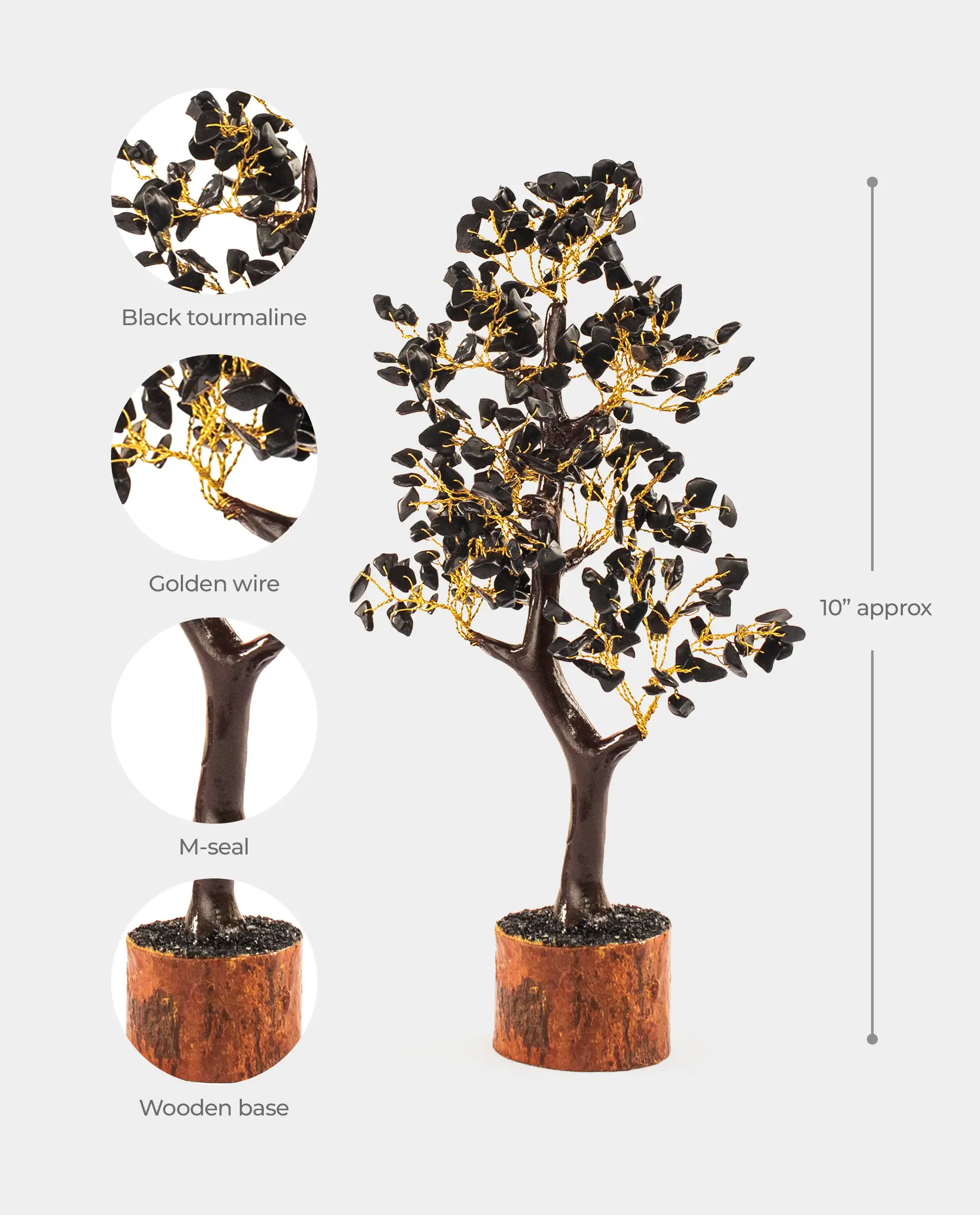 The tree features natural black tourmaline crystal chips, known for their grounding and protective properties.
