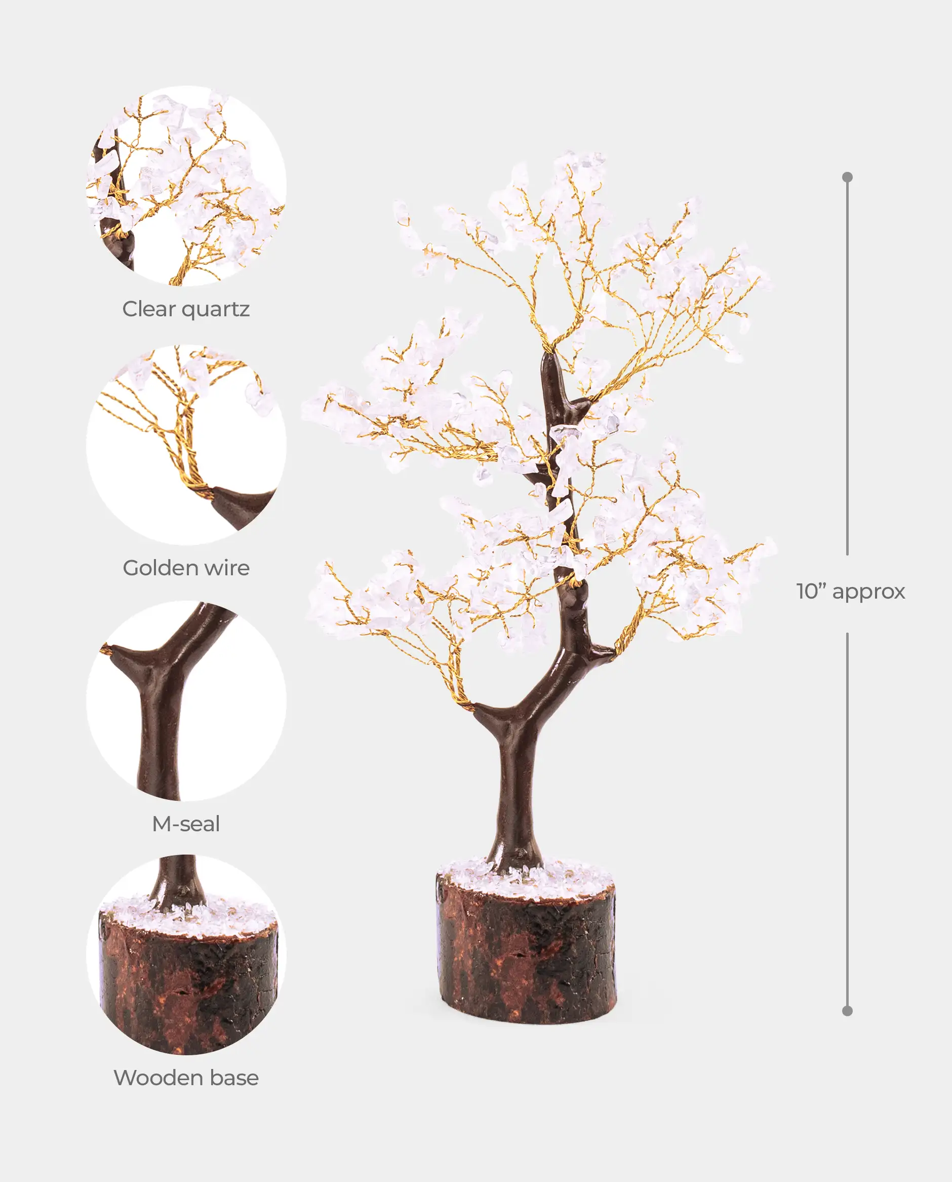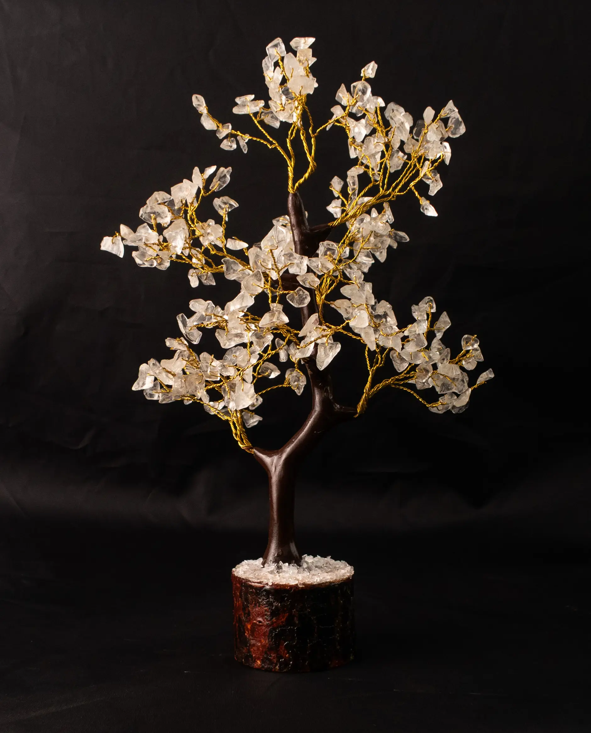 The tree features natural Clear Quartz crystals, known for their amplifying and clarifying properties.