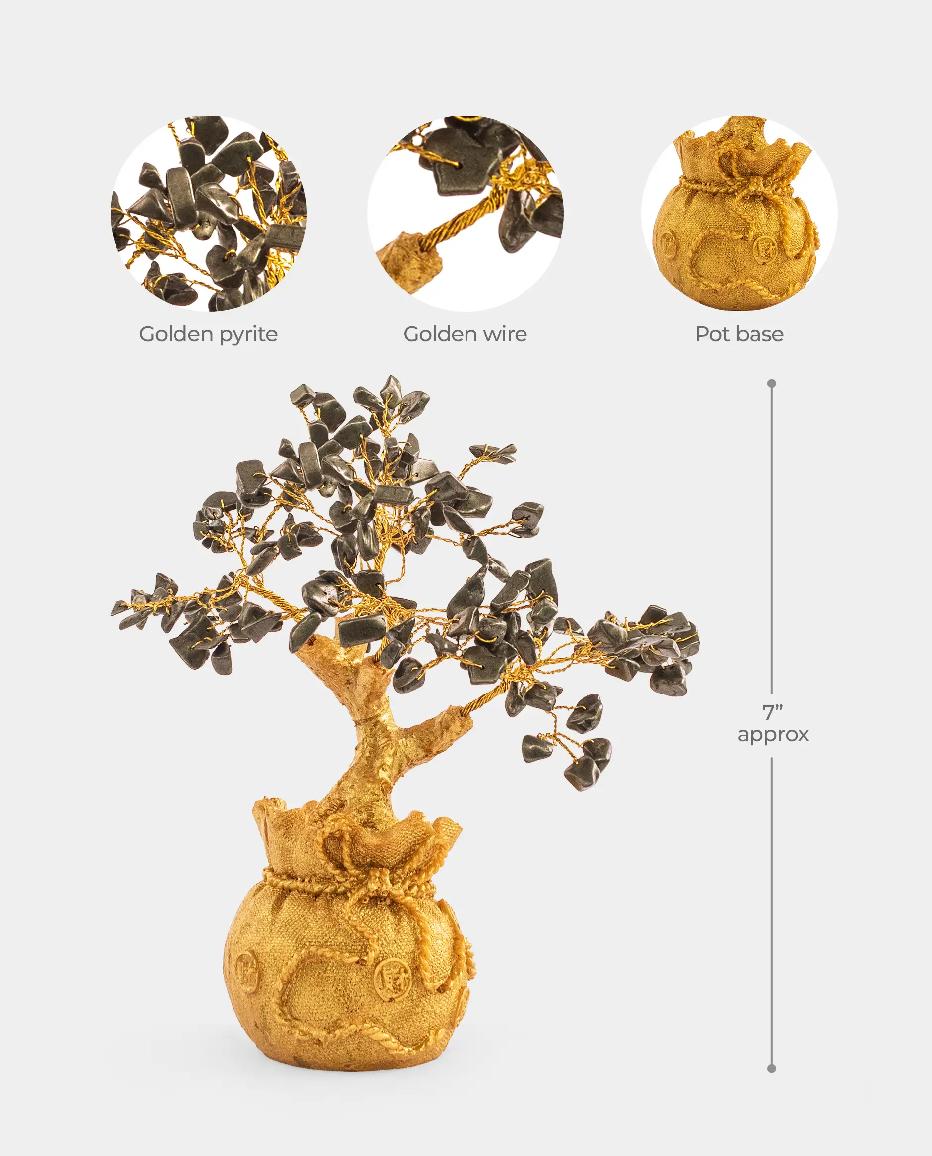 The tree is adorned with natural pyrite crystal chips, known for their wealth-attracting properties.