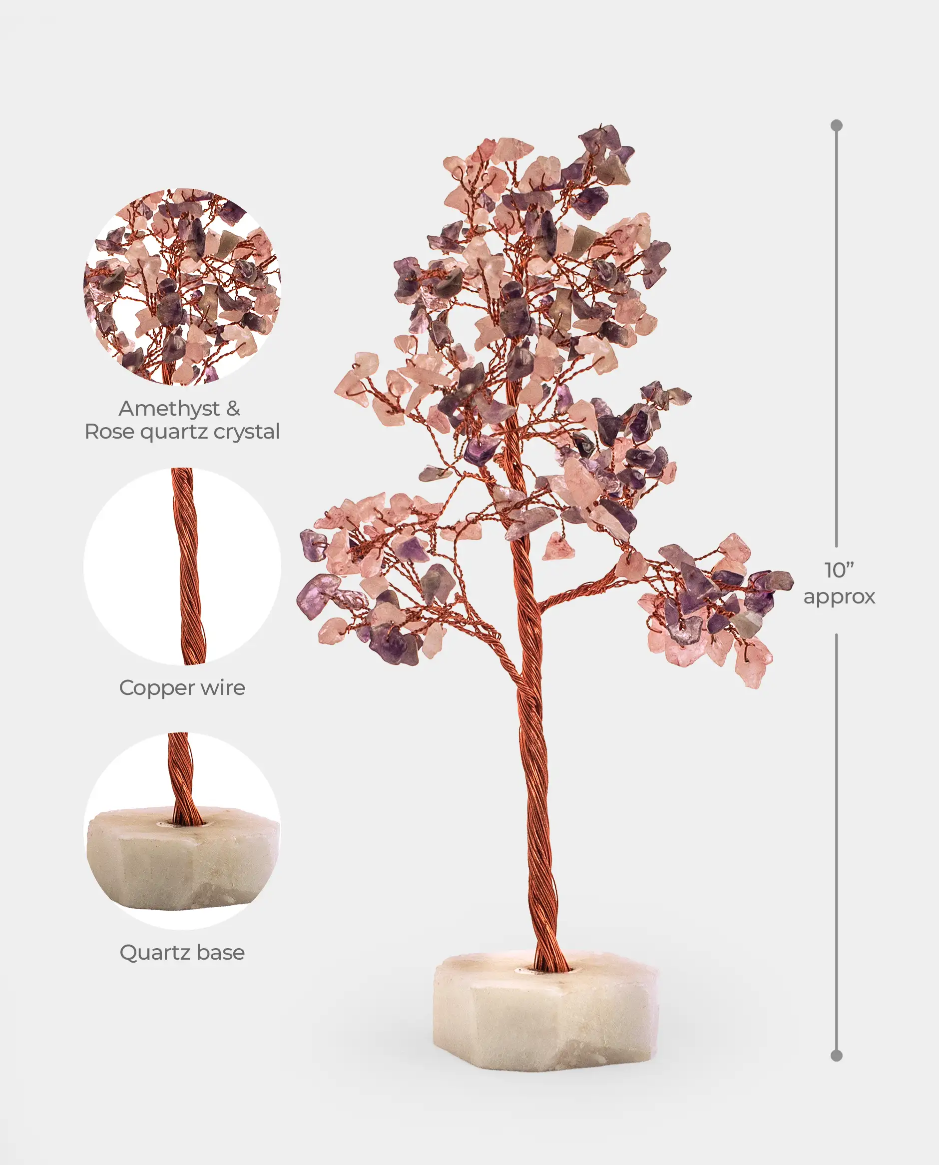 These trees are made with natural, genuine amethyst and rose quartz. Each chip carries its own unique coloration and subtle variation.